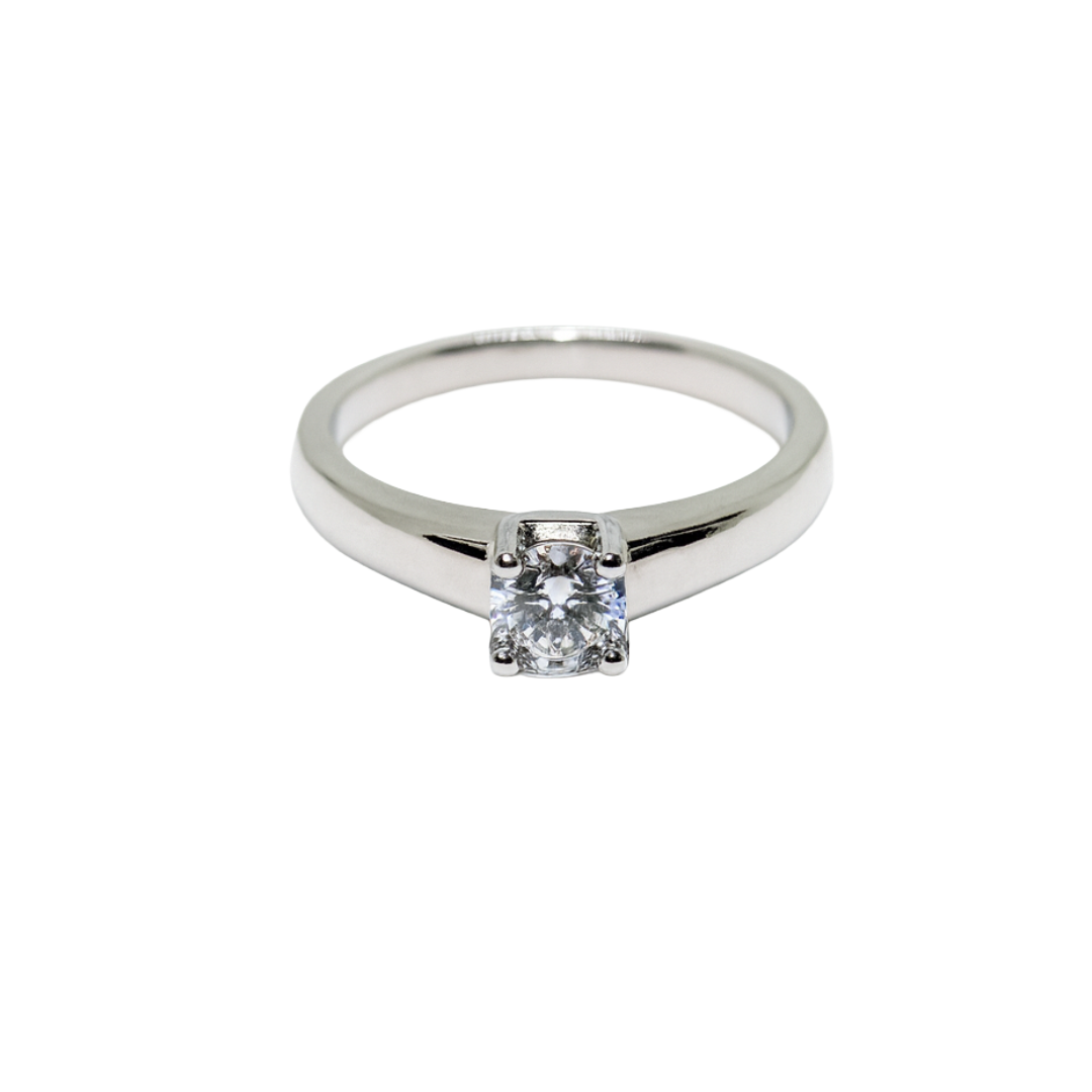 A timeless engagement ring crafted in radiant white gold tone, featuring a brilliant round-cut cubic zirconia set in a secure four-prong setting. Its minimalist band and refined polish create a stunning symbol of love, purity, and everlasting commitment.