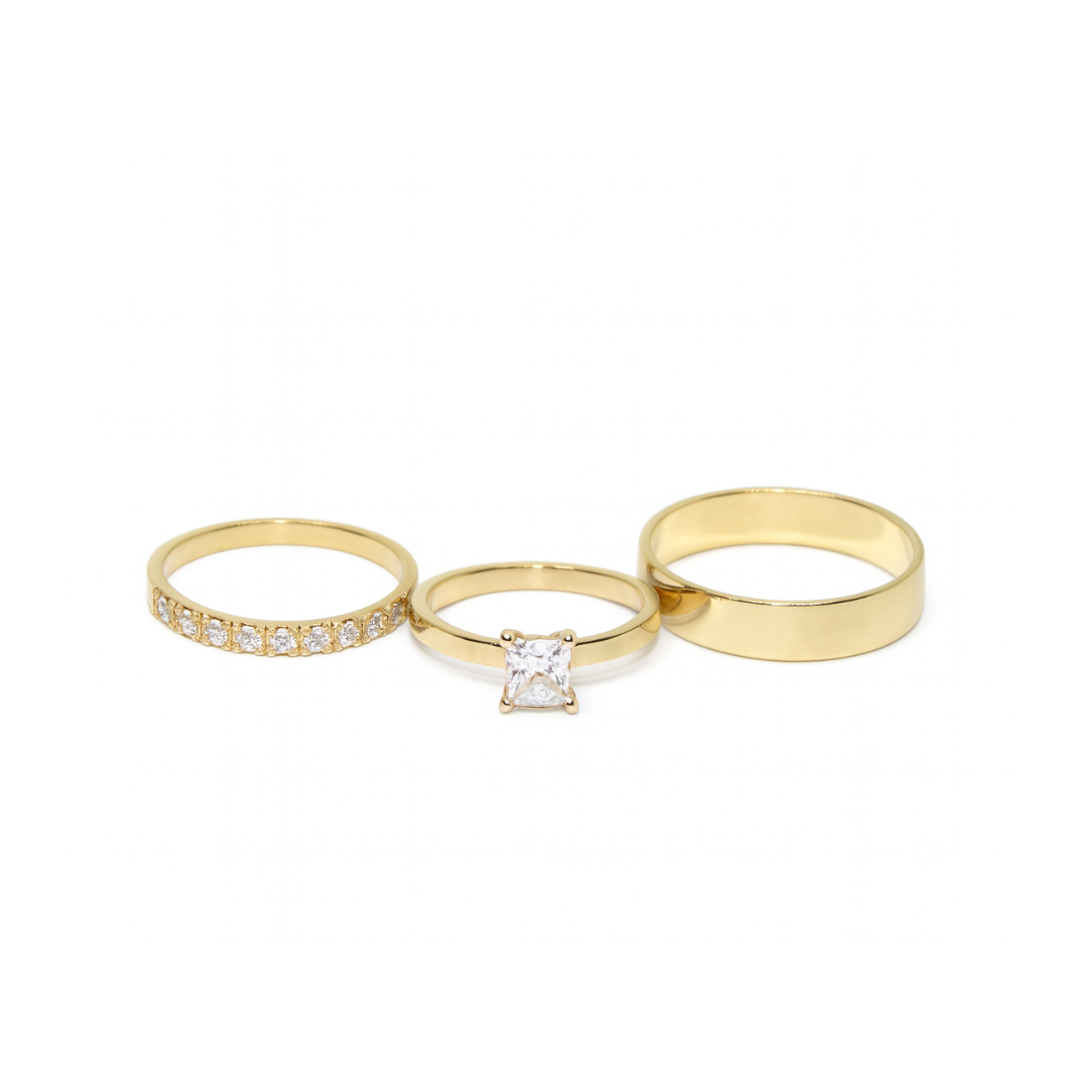 A stunning three-piece bridal set crafted in radiant gold tone. The engagement ring features a dazzling princess-cut cubic zirconia in a four-prong setting, paired with a delicate band adorned with sparkling stones, and a classic solid wedding band for a timeless finish.
